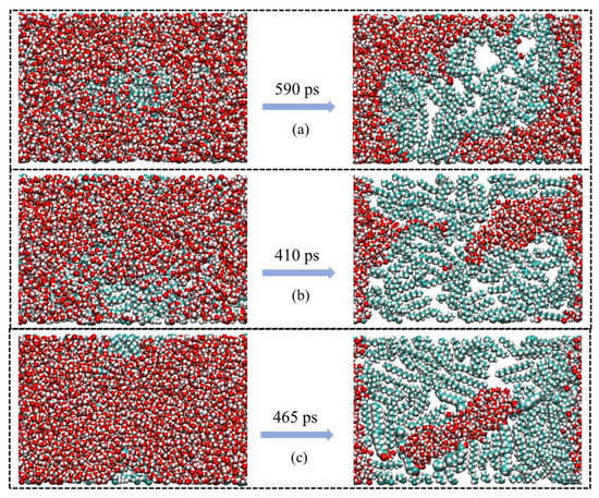 It can be found that in the process of bubble adhesion, several collector molecules migrate to the gas–liquid interface. The compound collector molecules form an oil ring at the gas–liquid–oil three-phase contact line (the oil film forms two rows of protrusions on the three-phase contact line in the case of cylindrical bubbles; inferred from this, in the case of spherical bubbles, the bulge will be connected into a ring, which can be called an oil ring). All three proportions of compound collectors can form an oil ring. Furthermore, it is found that a small fraction of OA molecules (some polar groups of collectors face outward, and most OA molecules spread on the surface of LRC) at the gas–oil interface migrate to the oil ring comparing Figure 8 with Figure 11. This is because the gas–liquid–oil three-phase line continues to move outward from the middle in the process of bubble adhesion. The adsorption of OA molecules in the oil film is more stable at the gas–liquid interface, so OA molecules will move outward following the three-phase line.