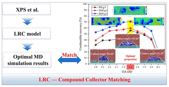 According to XPS results, flotation results, and simulation results, it is found that there is a certain correspondence between the oxygen content on the LRC surface and the optimal proportion. The flotation results indicate that the OA:DD = 1:3 compound collector has the best effectiveness to enhance the flotation process. The LRC surface model is established according to the XPS results, and its hydrophilic point accounts for one-third of the total surface. The flotation results are verified using the model to simulate the flotation process. The MD simulation results are consistent with the flotation results. The LRC model used in the MD simulation is based on the oxygen content on the LRC surface, indicating a corresponding relationship between the coal surface properties and the optimal compound proportion. The best proportion of compound collectors (polar collector ratio) fits well with the oxygen-containing sites on the LRC surface, which can be called the LRC–compound collector matching principle, as shown in Figure 14. In the future, our research focus will be on the improvement of this principle for LRC with different surface oxygen contents or coals with different metamorphic degrees, which will be a considerable workload and also important work in the field of flotation.
