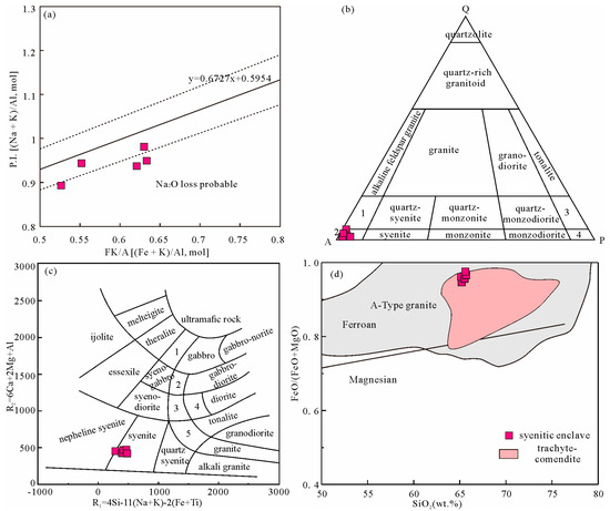 The whole-rock geochemical composition of the syenitic enclaves are shown in Table 1 and Table 2. The syenitic enclaves had a high loss on ignition (LOI, 1.03–1.71 wt%), and the high LOI may have been caused by the later alteration that resulted in low Na2O content [45] which was also observed in the host rocks [41]. Therefore, the Na2O concentration of syenitic enclaves was corrected using the method recommended by White [45]. A plot of FK/A vs. P.I. (FK/A = (Fe + K)/Al, mol, with all Fe calculated as Fe2+, P.I. = (Na + K)/Al, mol) was presented in Figure 4a, enclaves from 19ss036-1 and 19ss037-1 lied below the 95% confidence interval and demonstrated the Na2O loss. The Na2O-corrected syenitic enclaves showed weakly peralkaline affinity with peralkaline index (P.I.) = 1.00–1.08.