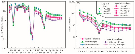 Primitive mantle normalized trace element distribution patterns (a) and chondrite normalized REE distribution patterns (b) for the syenitic enclaves in the Sanshui Basin. Syenitic enclaves of Kilombe are from [34], and syenitic enclaves of Azores are from [29,30]. Normalized values are from [50].