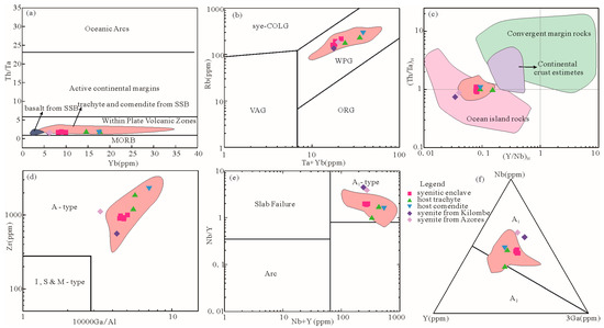 The major elements of the syenitic enclaves were similar to those of the trachyte exposed in the Sanshui Basin; they had high alkali content (Na2O*+K2O = 11.93–12.27 wt%), low MgO content (0.14–0.32 wt%), and low CaO (0.62–0.86 wt%), but the SiO2 content was restricted (<1 wt% variation). All of the syenitic enclaves fell in the field of alkaline feldspar syenite field based on petrographic observation (Figure 4b) and plotted in the syenite field according to the classification (Figure 4c). The syenitic enclaves were ferroan with a Fe/Fe+Mg value ranging 0.92 to 0.95, and alkaline with a MALI index (Na2O+K2O-CaO) range 11.40 to 11.61, corresponds to the A-type granite [48].
