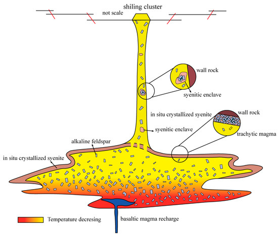 - The syenitic enclaves are the results of in situ crystallization of the trachytic magma in the shallow crust according to the thermobarometric calculation and petrological texture. The recharge of the basaltic magma triggered a trachytic and comenditic eruption, and the ascending trachytic and comenditic magma disaggregated the in situ syenitic crystallized crust which was brought to the surface as syenitic enclaves.