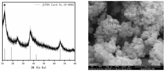 The δ-MnO2 nanoparticles were prepared in accordance with the methods described by Subramanian [30]. The sample was washed with double-deionized water and then freeze-dried. The dried sample was lightly ground. The morphological properties, phase, particle sizes, and functional groups of δ-MnO2 were characterized via SEM (Figure 2a) and XRD (Figure 2b), respectively.