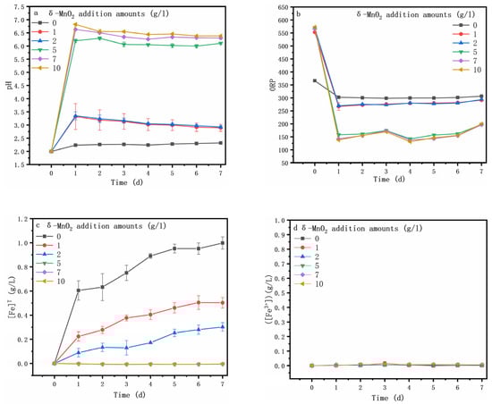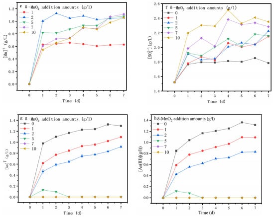 Figure 3b shows the ORP (oxidation–reduction potential), which plays a crucial role in the dissolution of the mineral [34] and is correlated with the c(Fe3+) to c(Fe2+) ratio and solution pH [35,36]. In this study, the ORP was mainly determined via the solution pH because the iron ions in the solution were Fe2+ (Figure 3c,d). The ORP was sharply decreased at day 0 to 1, likely due to the sharp rise in pH (Figure 3a), which was reflected by the rapid increase in [Mn]T (Figure 3e) (Equations (1), (3) and (5)). Additionally, then, the ORP increased gradually on the following day, in good agreement with the pH variation. It can be seen that the increase in δ-MnO2 content led to a rise in pH and a decrease in ORP. For the assay without the δ-MnO2 addition, both [SO42−] (Figure 3f) and [Fe]T (Figure 3c) contents increased dramatically from day 0 to 1, while the [SO42−] content remained relatively stable, and the [Fe]T increased gradually on the following days, most likely due to the arsenopyrite oxidative dissolution (Equation (4)). However, the addition of δ-MnO2 resulted in a constant rise in the [SO42-] content (Equation (6)) and a decrease in the [Fe]T content.