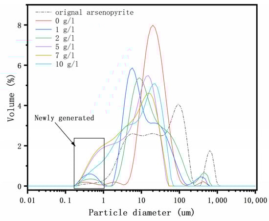 The particle size distributions of the arsenopyrite and chemically oxidized residues were analyzed. The results are depicted in Figure 4 and listed in Table 1. According to the particle size distribution curves, the particle size of the arsenopyrite mineral ranged from 0.2 to 954 μm, and exhibited a wide distribution. The size of 90% of particles was smaller than 176.06 μm. In the absence of δ-MnO2, the particle size distribution curve indicated that the proportion of arsenopyrite particles featuring sizes in the range of 1~10 μm, 70~100 μm, and 400~1000 μm decreased. In contrast, the proportion of mineral particles exhibiting sizes in the range of 10~60 μm increased significantly. According to these findings, elevated temperatures promote the oxidative dissolution of arsenopyrite. As the δ-MnO2 concentration increased, the Dv(10), Dv(50), and Dv(90) values of the samples decreased. This indicates that the fraction of fine particles in the oxidized residues increased, the proportion of the coarse particles decreased, and the particle size distribution became more concentrated. As the amount of δ-MnO2 increased, the proportion of fine minerals increased while the proportion of coarse minerals decreased. This demonstrated that δ-MnO2 promoted the oxidation dissolution of minerals synergistically, and the continued redox reaction led to the elimination of the mineral coating.