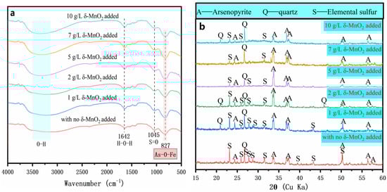 The FT-IR spectra for the oxidized residues without and with δ-MnO2 at day 7 are depicted in Figure 6a. The results show that the peak intensities for S=O (SO42−) at 1045 cm−1 and As(V)–O–Fe at 827 cm−1 of the amorphous ferric arsenate in the oxidized residues increased significantly with the addition of δ-MnO2 supplement [38,39]. This indicated that the surface of oxidized residue was an enriched sulfate and an amorphous ferric arsenate.