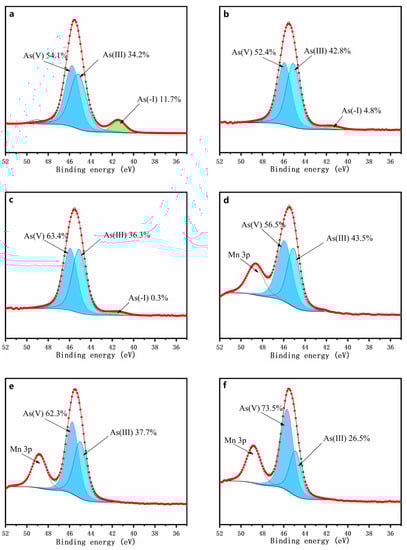 XPS spectra of arsenic on the surface of the oxidized residues for 7 days with the addition of 0 (a), 1 (b), 2 (c), 5 (d), 7 (e), and 10 g/l (f) of δ-MnO2.