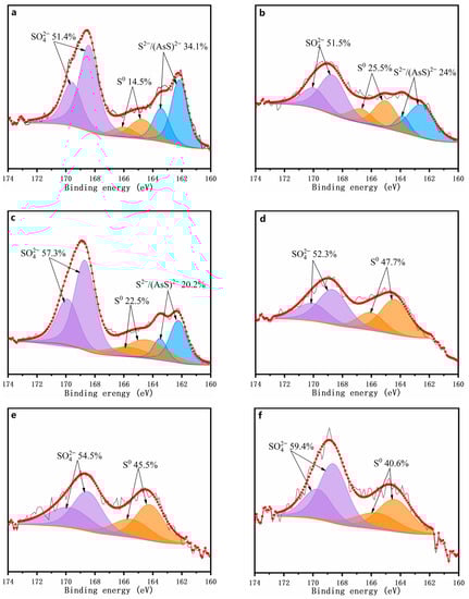 The XPS spectra of the S 2p for the chemically oxidized residues for 7 days are depicted in Figure 8. The peak representative of the As–S bond is hard to distinguish from that of S–S because of their high similarity [42]. Thus, (AsS)2− in the present study refers to the sum of (AsS)2− and S22− species. The oxidized residues’ surface sulfur species for the assays were mainly S22−/(AsS)2− (162.3 ± 0.3 eV), S0 (164.4 ± 0.4 eV), and SO42− (168.5 ± 0.2 eV). By comparing the distributions of these sulfur species in the chemically oxidized residue without δ-MnO2 being added (Figure 8a), it can be found that the sulfur oxidation was obviously enhanced when ≥1 g/L of δ-MnO2 was added (Figure 8b–f). According to the fitted results (Figure 8), the surface of the oxidized residue was enriched in elemental sulfur, which is consistent with the XRD results.