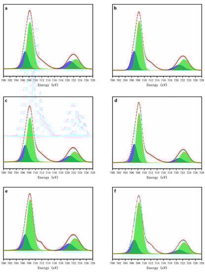 The Fe L-edge spectra for the chemically oxidized residues for 7 days are depicted in Figure 9. Both the L3-edge peaks at 706.8 eV and 708.3 eV and the two L2-edge peaks at 719.9 eV and 721.9 eV could be attributed to ferrous sulfate (Fe(II)) and ferric sulfate (Fe(III)), respectively [45]. For the chemically oxidized arsenopyrite, the peak area ratios of Fe(II) to Fe(III) for the L2,3 edges reflect the conversion of Fe(II) speciation into Fe(III) speciation [46], i.e., the area of the peak for Fe(II) decreased with the increase in the area of the peak for Fe(III). This result indicates that Fe(II) was gradually oxidized to Fe(III) on the mineral surface, and such oxidation was accelerated by the addition of ≥1 g/L of δ-MnO2. These results indicated that the presence of δ-MnO2 promotes the transformation of Fe(II) to Fe(III) on the mineral surface during the chemical oxidation of arsenopyrite. Combined with the changes of solution parameters (Figure 3c,d) and phase transformation (Figure 6), this clearly indicate the presence of δ-MnO2 makes the iron oxidation on the arsenopyrite surface.
