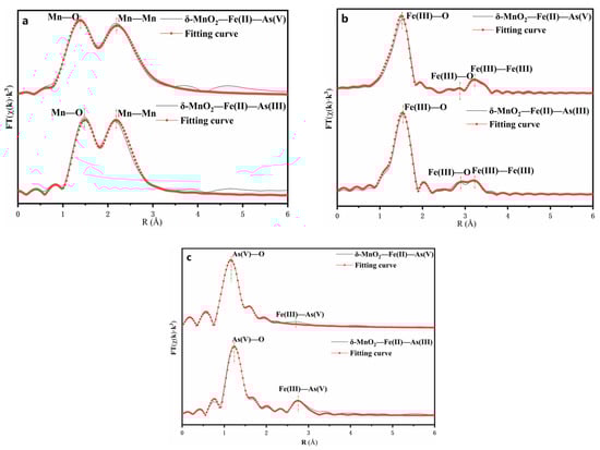 The EXAFS spectra of As, Fe, and Mn are shown in Figure 10. The fit results are listed in Table 3. The similarity between the experimental Mn χ(k) spectra of all samples indicates that the Mn atomic environment did not changed (Figure 10a and Table 3). In both systems, the Mn–O and Mn–Mn distance and coordination numbers were found to be remarkably constant after fitting the EXAFS spectra. This result indicated that the δ-MnO2 was structurally stable in both systems, and that the Mn in the core layer was stable as δ-MnO2, preserving the octahedral structure of the hydromanganese ore [47].
