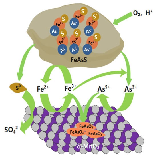 Based on the findings above, the mechanisms involved in the oxidative dissolution of arsenopyrite mediated by δ-MnO2 can be proposed as depicted in Figure 11.