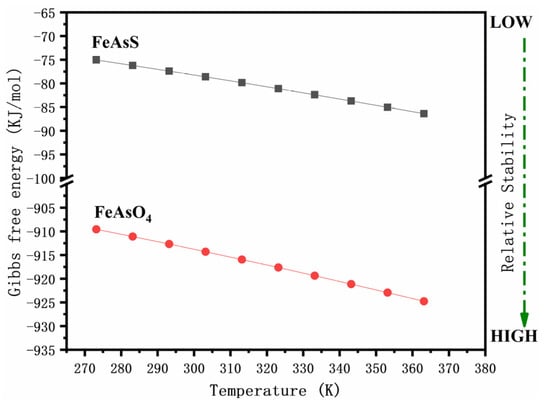 The generated FeAsO4 covered the particle surface with a loose and porous structure, thus facilitating the oxidative dissolution of arsenopyrite. Notably, with the addition of δ-MnO2, the pH rapidly approached 7 and the concentration of iron and arsenic in the solution decreased continuously until the addition exceeded 5 g/l, at which point the arsenic and iron were almost undetectable. The large amounts of ferric arsenate accumulated on the particle surfaces. The Gibbs free energy indicates that the resultant amorphous ferric arsenate was relatively stable (Figure 12). These factors result in the immobilization of arsenic and the reduced mobility of arsenic in the environment.