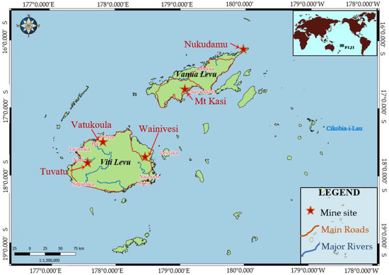 Despite Fiji’s long mining history and growing interest in mineral development, there remain limited available narratives about mining, which concentrate mostly on the benefits of mineral extraction with little literature explaining the orebody’s geochemical nature. The Vatukoula Gold Mine (VGML), because of its long existence, is the most studied mine in Fiji [11,12,13,14,15,16,17]. However, only a few studies have been conducted on the other mining areas of the country. Moreover, the majority of these previous works focused on the chemical properties of river water and its sediments, including heavy metals and metalloids in Fiji’s mine sites. Kumar et al. (2021), for example, highlighted the influence of the discharge from the Toko tailings storage facility (TSF) of Vatukoula on the nearby river sediments [11]. These authors conducted a similar study on potentially toxic elements across the Wainivesi River, which also receives discharge from the Wainivesi mine [13]. In both studies, they assumed that mining discharges contributed to the contamination of the rivers since the mine sites are located within the study area but failed to directly relate the contamination with certainty to the respective mines.