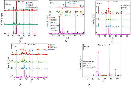 XRD patterns for the mineralogical composition of (a) Mt Kasi, (b) Nukudamu, (c) Tuvatu, (d) Vatukoula, and (e) Wainivesi.