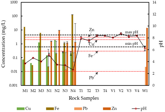Although Cu, Fe, Pb, and Zn were detected in the leachates, they were not consistently leached from all the rock samples (Figure 3; Table S4). Higher concentrations of Fe at 16.8 ± 3.72 mg/L, 6.08 ± 1.45 mg/L, 1.15 ± 0.20 mg/L, and 129 ± 0.20 mg/L were observed at Mt Kasi (M1, M3) and Nukudamu (N3, N4), respectively, which exceeded the limit for Fe (<0.3 mg/L) in drinking water. Copper leached only from the Mt Kasi and Nukudamu samples at lower concentrations of up to 1.94 ± 0.41 mg/L (N2) and was around the WHO drinking water standard at 2 mg/L. High Zn concentration was observed in the leachates of samples from Wainivesi (14.2 ± 3.22 mg/L) and Nukudamu (N2; 9.54 ± 1.32 mg/L). Meanwhile, Pb leached only from two of the four Nukudamu rock samples (N3 and N4) with concentrations of 0.02 ± 0.02 and 0.05 ± 0.06 mg/L, respectively, and concentrations of 0.02 ± 0.04 mg/L for the Wainivesi sample. Compared with the WHO guidelines for dissolved Pb and Zn in drinking water, the Nukudamu (N3 and N4) and Wainivesi rock samples exceeded the threshold limit of 0.01 mg/L for Pb, while N2 exceeded the limit for Zn 3 mg/L. The high Pb leaching concentration from the Wainivesi rock samples could be the possible reason for the elevated levels of Pb found in the Wainivesi River [13].