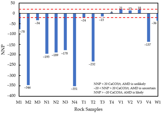If the NNP value is below −20 kg CaCO3/t, acid generation is likely to occur; if the NNP value is between −20 and 20 kg CaCO3/t, the acid generation is uncertain; and if the NNP value is above 20 kg CaCO3/t, the rock sample is unlikely to generate any acidity.