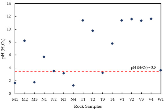 The pH (H2O2) test was considered alongside the ABA technique to accurately predict the likelihood of acid generation of the rock samples. The method follows the Japanese Geotechnical Standard—JGS 0271-2016, [42] a streamlined technique that simulates the long-term natural process of mineral breakdown through weathering in cases of mineral extraction caused by mining. The pH (H2O2) acidification test uses the oxidation principle, in which H2O2, a strong oxidant, oxidizes sulfide minerals exposed during the test. In the experiment, H2O2 solution was first prepared by neutralizing a pre-determined volume of 30% H2O2 to pH 6 using 10 mmol/L of NaOH. Rock samples weighing 2 g (<2 mm) each were transferred into 100 mL beakers (mt = wt. of beaker + wt. of sample), and then 20 mL of H2O2 was carefully added. The beakers were covered in plastic wrap with holes to release pressure during oxidation. The solution was then placed in a sand bath heated to 60 °C in a fume hood. Any violent reaction was controlled by stirring the solution or temporarily removing it from the sand bath to cool. The reaction was completed when fizzing or bubble formation became negligible. The solution was then allowed to cool down to room temperature. The beaker and the remaining solution were reweighed, and DI water was added until the new weight of mt + 20 g was reached. The resultant solution was thoroughly mixed and the pH was measured. The pH threshold acidification potential is 3.5, and samples with pH < 3.5 have AMD-generating potential [43,44].
