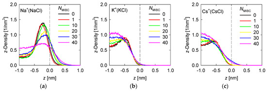 To analyze the density profiles of chloride salt ions in Figure 4, the differences in the Pauling electronegativities of the salt atoms are helpful. Subtracting the electronegativity of the cation from that of the chlorine gives 2.1 for NaCl, 2.2 for KCl, and 3.0 for CsCl. As the size of the cation increases, the ionic character of the salt increases, even though all these chloride salts are ionic. In the absence of MIBC, the ions from the chloride salts tend to accumulate near the liquid–vapor interface, although always in the liquid phase, giving rise to peaks in the density profiles, as shown in Figure 4. However, the location of the peak density of each ion depends on the ionic character of the salt. The more ionic the salts, the greater their tendency to dissolve and remain within the liquid phase, far from the liquid–vapor interface. For NaCl, the Na+ and Cl− density peaks reach approximately 1.5 nm−3, although the Cl− density in all simulations is consistently somewhat higher than that of Na+ (Figure 4), which is in agreement with the literature [6,7,9,18], while the density of these ions in the bulk liquid solution is ca. 0.5 nm−3. The Na+ peak occurs at ca. 0.25 nm from the interface, while the Cl− peak occurs much closer to the interface at ca. 0.125 nm. On the other hand, for CsCl, the most ionic chloride salt, the Cs+ and Cl− peaks reach ca. 0.8 nm−3 while the density in bulk is ca. 0.6 nm−3. The Cs+ peak occurs relatively far from the interface at ca. 0.5 nm, while the Cl− peak also moves away at ca. 0.3 nm. The KCl salt with an intermediate ionic character between NaCl and CsCl is expected to exhibit intermediate densities and density peak positions for the K+ and Cl− ions. Indeed, Figure 3 shows that the peak densities are ca. 1 nm−3 for the Na+ and Cl− peaks and 0.7 nm−3 for the solution bulk. Moreover, the positions of the K+ and Cl− density peaks are, respectively, 0.4 nm and 0.2 nm from the liquid–vapor interface. In the presence of MIBC, the ions of the salts are displaced toward the bulk of the liquid as Figure 4 also shows. This effect is more pronounced as MIBC concentration increases. At the maximum MIBC concentration considered here, it is notable that ions of the more ionic chlorides, such as KCl and CsCl, are fully displaced from the interface into the bulk liquid, while few ions of the somewhat less ionic NaCl continue to show a preference for the liquid–vapor interface at a significantly lower concentration than in the absence of MIBC although closer to the interface to ca. 0.2 nm. As expected, MIBC molecules with surfactant properties, albeit weak, settle at the liquid–vapor interface where they are distributed as in Figure 3.
