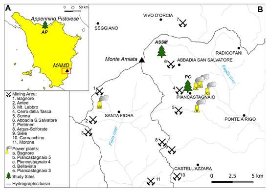Chestnut trees were sampled at two sites in the MAMD: (i) near the former Abbadia San Salvatore mine (ASSM), the largest mining and smelting center of the district and (ii) near the main geothermal power plant in the Piancastagnaio municipality (PC). At each site, three trees were sampled. Two trees were also sampled in the Appennino Pistoiese (AP; 150 km away from MAMD) that was selected as a reference background area (Figure 1).