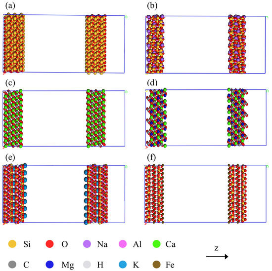Molecular models of slit nanopores in various shale minerals: (a) Quartz; (b) Albite; (c) Calcite; (d) Dolomite; (e) Illite; (f) Chlorite.
