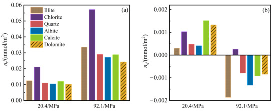 Methane amount in different shale minerals (150 °C): (a) Total gas amount; (b) Excess adsorption amount.