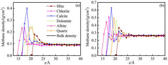 Methane density profile in the slit of different shale minerals (150 °C): (a) 20.4 MPa; (b) 92.1 MPa.