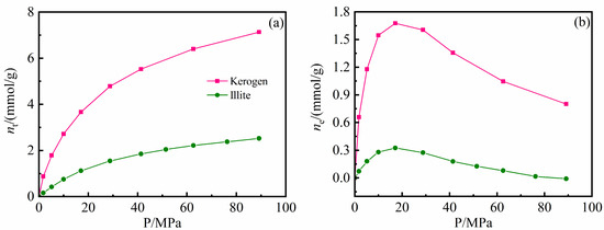 Methane amount in the nanopores of shale kerogen [1] and illite [35] (120 °C): (a) Total gas amount; (b) Excess adsorption amount.