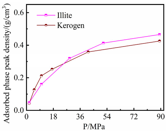 Figure 5 shows similar trends and values for the peak density of the methane adsorption phase on the slit pore walls in the illite and kerogen models. The peak density of the methane adsorbed phase was averaged from the two adsorption peaks on the two slit surfaces based on the methane density profile. The methane density profile was determined by averaging the last 500 snapshots, and the standard error was less than 3%. The peak density increases with pressure, but the rate of increase becomes small at high pressure. At pressures higher than 20 MPa, the peak density of the adsorbed phase on the kerogen slit surfaces is slightly lower than that on the illite slit surfaces, resulting in a greater decrease in the excess adsorption amount in the kerogen pores at high pressure. Figure 5 shows that kerogen and illite slit pores do not differ significantly in terms of their intrinsic adsorption capacity for methane. The higher adsorption capacity of kerogen than illite shown in Figure 4 can be attributed to the lower molar mass and large intermolecular porosity of the kerogen skeleton. The intermolecular pores, which are mainly ultra-micropores with pore diameters <0.7 nm, have large specific surface areas and could provide abundant adsorption sites in the kerogen model.