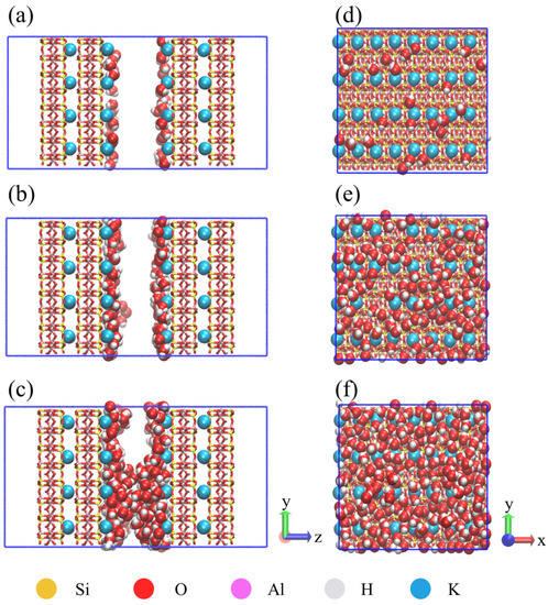 Water distribution in illite nanopores (2 nm): (a) Water content of 7.17% (side view); (b) Water content of 29.53% (side view); (c) Water content of 63.54% (side view); (d) Water content of 7.17% (top view of pore wall); (e) Water content of 29.53% (top view of pore wall); (f) Water content of 63.54% (top view of pore wall).