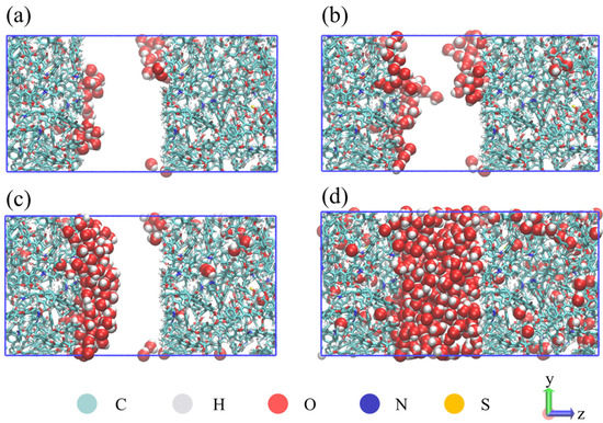Water distribution in kerogen nanopores (2 nm): (a) Water content of 11.10% (side view); (b) Water content of 12.17% (side view); (c) Water content of 32.23% (side view); (d) Water content of 64.28% (side view).
