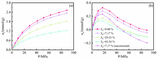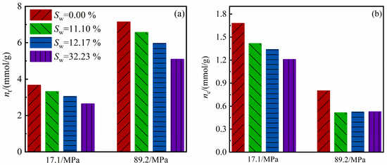 Methane amount in illite nanopores with different water contents (Sw) (120 °C): (a) Total gas amount; (b) Excess adsorption amount.
