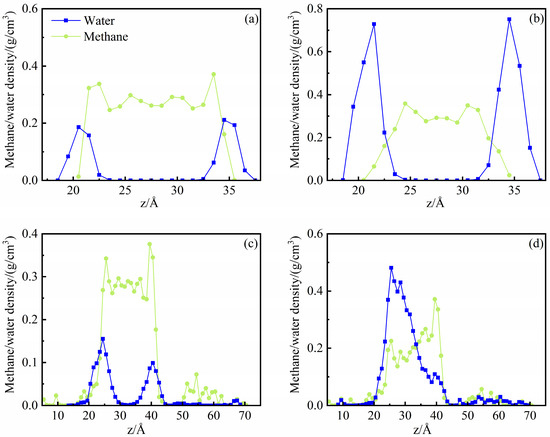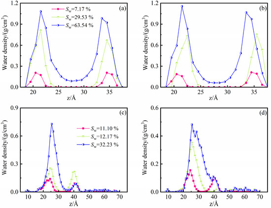 In order to study the effect of methane adsorption on water distribution in water-bearing pores, the water density profiles in the illite and kerogen pores before and after methane adsorption were compared (Figure 10). As seen from Figure 10a, water molecules are preferentially adsorbed on the pore walls of illite before methane adsorption. The adsorption layer density of water molecules gradually increases with increasing water content. At the water content of 63.54%, the water adsorption layer is over-saturated, and part of the water molecules escape to the middle pore spaces. By comparing the water density profiles before and after methane adsorption (Figure 10a,b), methane adsorption is observed to have little effect on water distribution in illite. This indicates that illite is strongly hydrophilic and the interaction of pore walls with water molecules is greater than that with methane molecules. Methane molecules cannot replace water molecules preferentially adsorbed on the illite walls.
