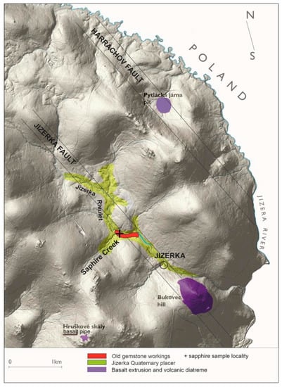 The primary host rocks of the gemstones (sapphire and zircon) and abundant Mg-ilmenite (“iserine”) in the Jizerka alluvial placer are not known, but could be related to the cluster of alkaline basalt extrusions in the vicinity of Jizerská louka Meadow [14,22]. They are represented by Bukovec hill nephelinite, Pytlácká jáma Pit buried volcanic diatreme and Hruškovy skály basalt pipe (Figure 2).