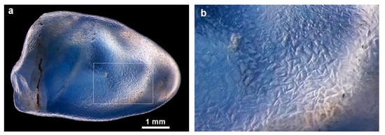 (a) An example of the anhedral Jizerka placer blue sapphire; (b) detail of the sapphire surface showing a “bladed” surface texture as the traces of magmatic corrosion. The surface features of the Jizerka sapphire indicates minimal downstream reworking by fluvial transport. It suggests that the sapphire source is located rather close to the Jizerka placer.
