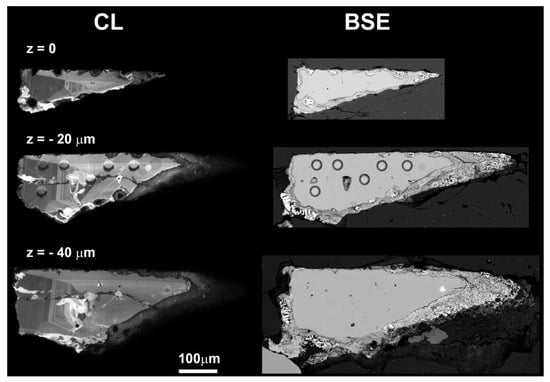 CL and BSE images of zircon inclusion (light grey in BSE) in sapphire (dark grey in BSE) with baddeleyite + SiO2 reaction rim (bright in BSE) at three vertical cross-cut levels as revealed by progressive polishing off the previously analysed layer with LA–ICP–MS craters. The LA–ICP–MS spots of U–Pb analysis are noticeable in the second set of images (z = −20 mm).