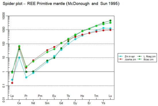 The high similarity of the chondrite-normalised REE composition of the zircon inclusion in the Jizerka blue sapphire to zircons from syenite xenoliths Loch Roag [3] and 5.6 Ma old zircons from Jizerka placer with zircon from nepheline syenite xenoliths from Bizac basalt [37] indicate their genetic link to alkaline igneous rocks (syenites and nepheline syenites) (Figure 7). However, according to Hoskin and Ireland [64], REE chemistry of zircons from a wide range of crustal rock types and tectonic settings exhibit similar characteristics and therefore zircon chemistry is not generally useful as an unequivocal indicator of provenance.