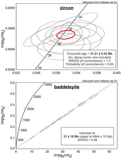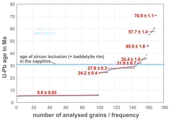 Both the zircon core and the baddeleyite rim of the zircon inclusion in the Jizerka blue sapphire were dated using the U–Pb in situ LA–ICP–MS method (Figure 8). The zircon inclusion core is visually older than its baddeleyite rim. In addition, the presence of zircon inclusions in the sapphire indicates their similar provenance and formation from the same parental rock. However, U–Pb dating conducted on the zircon core and baddeleyite rim of the inclusion in the Jizerka blue sapphire provided ages that are identical within their analytical uncertainties. The age of the zircon was found to be 31.2 ± 0.4 Ma (Figure 9), while a highly imprecise age of 31 ± 16 Ma was estimated for the baddeleyite rim (Figure 9). The high uncertainty of the baddeleyite U–Pb age is attributed to the low content of radiogenic Pb, low volume of the material available for dating and an excess of common lead due to intergrowth with other phases in the symplectitic mixture [42].