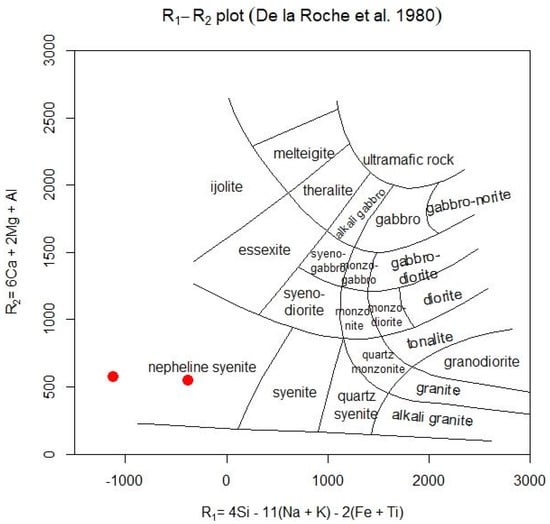 - De la Roche, H.; Leterrier, J.; Grandclaude, P.; Marchal, M. A Classification of Volcanic and Plutonic Rocks Using R1–R2 Diagrams and Major Element Analyses—Its Relationships with Current Nomenclature. Chem. Geol. 1980, 29, 183–210. [Google Scholar] [CrossRef]