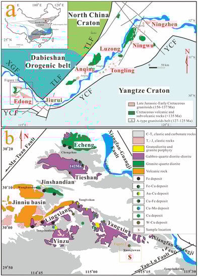 (a) Schematic illustration of the seven magmatic and metallogenic districts of the Middle and Lower Yangtze River metallogenic belt in the northeastern Yangtze Craton; (b) Granitoid batholiths in the Edong district. TLF-Tangcheng-Lujiang fault, XGF-Xiangfan-Guangji fault, YCF-Yangxin-Changzhou fault. Modified from Xie et al. (2011) [].