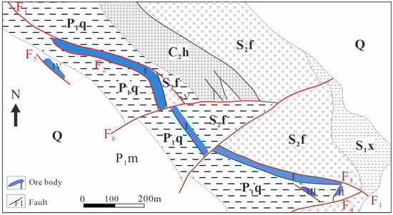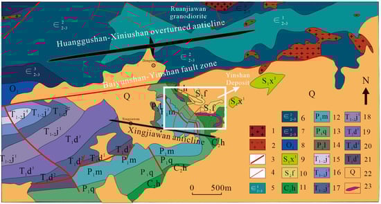 Geological map of the Yinshan Pb-Zn-Ag deposit (modified from Yan (2013) []). The abbreviation of the strata is the same as in Figure 2.