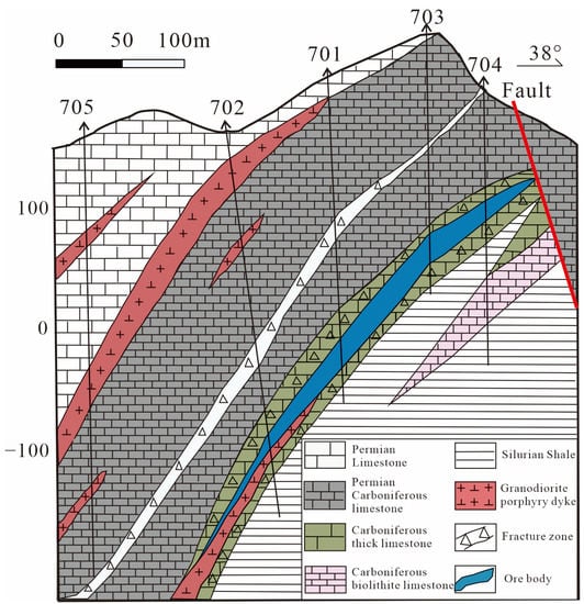 Geological map of Yinshan Pb-Zn-Ag deposit (modified from Yan (2013) []).
