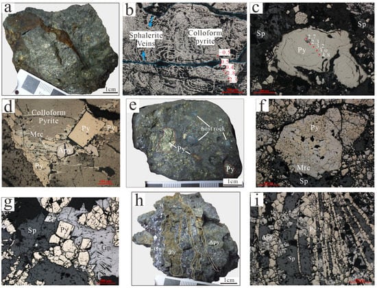 (a) Colloform and massive pyrite ores; Reflected light photomicrographs shown that (b) Colloform pyrite containing non-sulfide minerals was cut by sphalerite veins; (c) Colloform pyrite with little non-sulfide minerals was replaced by sphalerite; (d) Colloform pyrite was replaced by massive pyrite, and they were both replaced by marcasite. Euhedral pyrite and arsenopyrite veins cut all the above minerals; (e) Hand specimen of breccia ores, with massive pyrite and host rock as breccia, and cemented by hydrothermal minerals, such sphalerite, galena, and so on; Reflected light photomicrographs show that (f) the massive pyrite breccia were replaced by marcasite, and cemented by sphalerite; (g) The euhedral pyrite was replaced by galena and then sphalerite; (h) The hand specimen of the pyrite vein cut the early sulfide minerals, such as galena and arsenopyrite; (i) The pyrite vein cut through arsenopyrite and sphalerite in reflected light photomicrographs. The read scale bars represent 500 µm in (b,c,f,g,i) and 100 μm in (d). Apy—Arsenopyrite, Gn—Galena, Mrc—Marcasite, Py—Pyrite, Sp—Sphalerite.