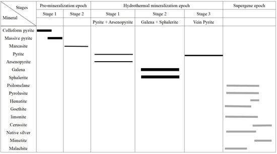 Figure 6 provides a summary of the metallogenic epochs and stage, incorporating findings from previous studies. The mineralogy of the supergene epochs were referenced from Yan (2013) [].