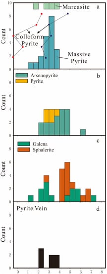 Histograms of sulfur isotopes for sulfide minerals from different epochs and stages. (a) The pre-mineralization pyrite epoch, followed by (b) the pyrite-arsenopyrite stage, (c) the galena-sphalerite stage, and (d) the vein pyrite stage during the hydrothermal mineralization epoch.
