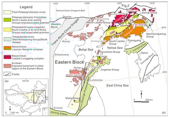 Simplified geological maps of the North China Craton (NCC) and the Jiao-Liao-Ji Belt (JLJB). (a) Tectonic setting of the NCC; (b) regional Precambrian geological map of the Eastern Block in the NCC (modified after [6]).