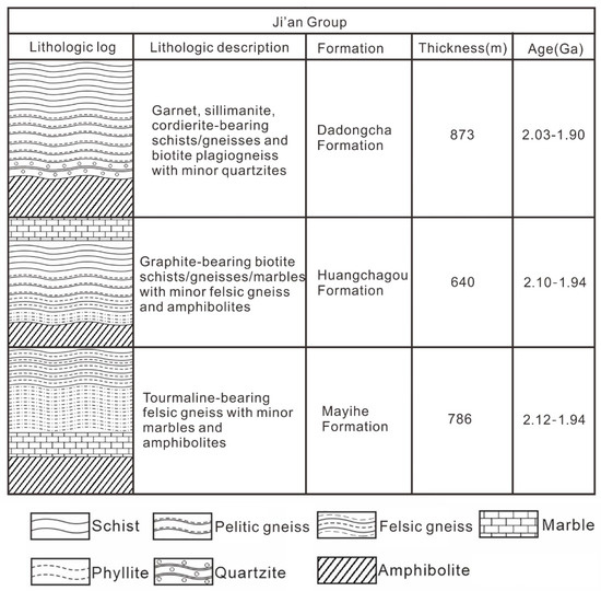 The Ji’an Group, distributed in the northeast of the Paleoproterozoic JLJB, is mainly exposed in Tonghua, Jilin Province (Figure 2). It is mainly composed of aluminous schist, pelitic gneiss, felsic gneiss, granulite, interlayered marble and thin-bedded quartzite [11]. Regionally, it can be compared with the South Liaohe Group, Jingshan Group and Motianling Group. The Ji’an Group is divided into Mayihe, Huangchagou and Dadongcha formations from the bottom upwards (Figure 3). The sediments are considered to have been deposited in an active continental margin environment at 2.2–1.9 Ga [33,34,35] and generally experienced greenschist to low-amphibolite facies metamorphism, with some parts of the sequence attaining high-amphibolite to granulite facies [11,35,36,37].