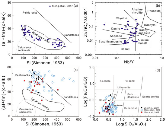 Classification diagrams for the metasedimentary and metavolcanic rocks. (a,c) (al + fm) − (c + alk) − Si, al = [Al2O3], fm = [FeO] + 2[Fe2O3] + [MnO] + [MgO], c = [CaO], alk = [K2O] + [Na2O] [44]; (b) Nb/Y versus Zr/TiO2*0.0001; (d) log (Fe2O3/K2O) versus log (SiO2/Al2O3) [45]. Data sources: [33,35,38,43,46].