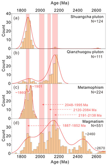 The Paleoproterozoic JLJB has a complex origin and underwent multistage evolution. The geochronology of the metasedimentary rocks and related granites can provide significant constraints on the formation of the JLJB. Based on the published zircon isotope geochronology data, zircon trace element data (e.g., Th and U) and the geochronological outline of the metamorphism and magmatism in the Ji’an Group [9,34,35,38,43,48], we provide constraints in the petrogenic age of the protoliths (detrital zircons with Th/U > 0.4), the metamorphic age of the metasedimentary rocks (metamorphic zircons with Th/U < 0.1) and the Paleoproterozoic magmatism (magmatic zircons with Th/U > 0.4). The metamorphic zircons in the Ji’an Group suggest that the metamorphism can be divided into two periods of 1950–1870 Ma and 1870–1800 Ma, with peak ages of 1901 Ma and 1860 Ma, respectively (Figure 7c). The ages of metamorphic zircons are consistent with the metamorphic events at 1.90 and 1.85 Ga suggested by Meng et al. [43]. Additionally, the younger ages down to 1800 Ma may indicate a cooling stage. The detrital zircons in the Ji’an Group show four statistical ages of 2191–2138, 2120–2084, 2048–1995 and 1887–1852 Ma, with peak ages of 2670 and 2460 Ma (Figure 7d). These data suggest four periods of magmatism in the Paleoproterozoic JLJB. The magmatic zircons of the porphyritic granite (Shuangcha pluton) are mainly concentrated in 1887–1852 Ma with ages of ~2175 Ma and ~2625 Ma. The magmatic zircons of the gneissic granite (Qianzhuogou pluton) yield ages of 2200–1800 Ma with peaks at 2191–2138 Ma. Consequently, we conclude that the gneissic granite was formed at 2191–2138 Ma, with a few zircon records of later magmatic events. The porphyritic granite was formed at 1887–1852 Ma and preserved inherited zircons with ages of ~2175 Ma and ~2625 Ma (Figure 7a,b).