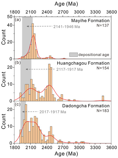 In this study, the maximum peak age of metamorphic zircons in the metasedimentary rocks was used to represent the minimum depositional age (>1901 Ma). Combined with the minimum peak ages of detrital zircons, the deposition ages for the Mayihe, Huangchagou and Dadongcha formations can be constrained to be 2141–1946, 2117–1917 and 2017–1917 Ma, respectively (Figure 8). These ages are similar to the depositional ages suggested by other authors [33,34,35].