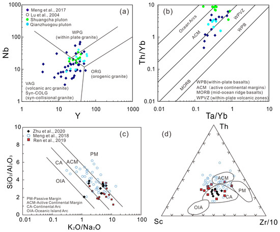 Discrimination diagrams of the metamorphic rocks and granites in the Qinghe area, Tonghua. (a) Y versus Nb diagram for the granites in the study area [57]. ORG: Orogenic granite; syn-COLG: syn-collisional granite; VAG: volcanic arc granite; WPG: within-plate granite; (b) Th/Yb versus Ta/Yb variation diagrams for the metavolcanic rocks; (c) SiO2/Al2O3-K2O/Na2O; (d) Th-Sc-Zr/10 [47]. PM—Passive margin; ACM—active continental margin; CA—continental arc; OIA—oceanic island arc. Data sources: [33,35,38,43,46].